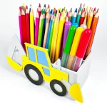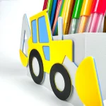 Przybornik z akcentem koparki dodaje dynamicznego wyglądu do przestrzeni, w której jest umieszczony. Może to być szczególnie atrakcyjne dla fanów wszelkiego rodzaju pojazdów.